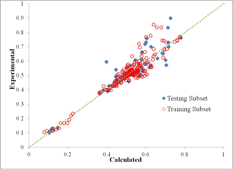 578 datasets for surface tension of 20 hydrocarbon mixtures at different temperature and composition were collected [24] in addition to the critical temperature, critical pressure, critical volume, acentric factor, normal boiling point, molecular weight and ideal liquid density for pure components which were considered as the input for the ANN. Table 2 shows the list of hydrocarbon mixtures, the number of data point for each mixture and the temperature range. Furthermore, Table 3 shows the values of the physical properties of pure hydrocarbons. In this study, the data sets were divided into three parts: training subset (60% of all data), validation subset (10% of all data) and testing subset (30% of all data). To avoid larger number from overriding smaller number, all data is normalized between [0.1-0.9] using Eq. 11.