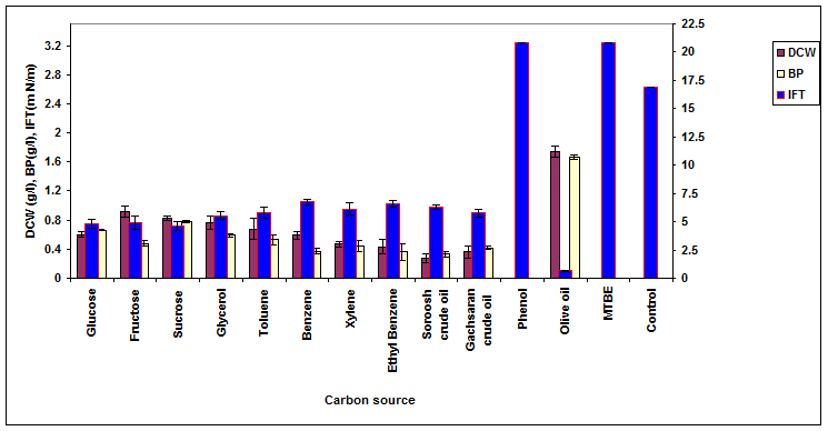The effect of various carbon sources (all in 0.5% w/v) on the growth, biosurfactant production and surface activity of ERCPPI-2 is shown in Figure 2. The best biosurfactant production of 1.67 g/l, interfacial tension of 0.65 mN/m and surface tension of 31.7 mN/m was obtained when the cells were grown in the presence of olive oil as the carbon source. In contact with Gachsaran crude oil, the results were 0.42 g/l, 5.75 mN/m and 41.2 mN/m, respectively.