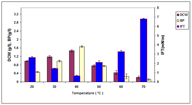Figure 3. The effect of temperature on the growth, biosurfactant production and surface activity of consortium ERCPPI-2 [20].