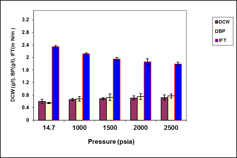 Figure 4. The effect of pressure on the growth, biosurfactant production and surface activity of consortium ERCPPI-2.