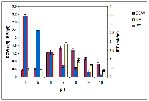 Figure 5. The effect of pH on the growth, biosurfactant production and surface activity of consortium ERCPPI-2 [20].