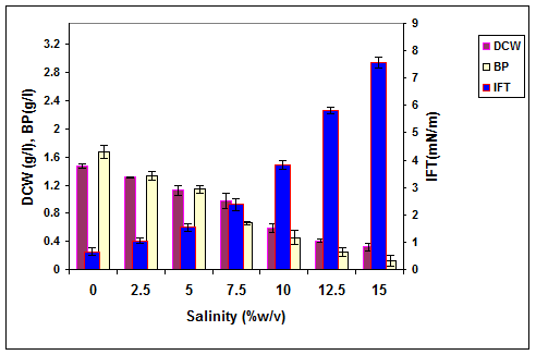 Figure 6. The effect of salinity on the growth, biosurfactant production and surface activity of consortium ERCPPI-2 [20].