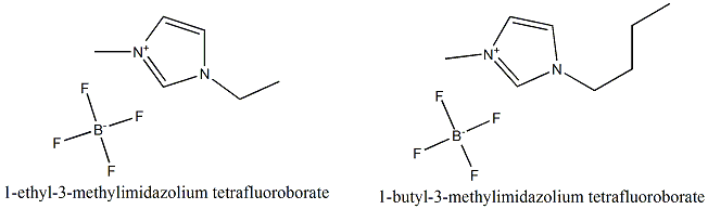 Tow imidazolium based ILs ie. 1-ethyl-3-methylimidazolium tetrafluoroborate [C2-mim][BF4] and 1-buthyl-3-methylimidazolium tetrafluoroborate [C4-mim][BF4] were used in this work. Figure 1 demonstrates chemical structures of the investigated ILs.