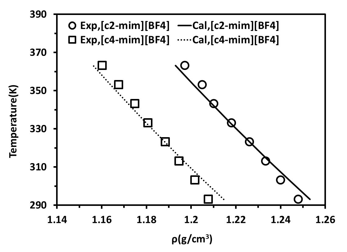 The resulting density− temperature diagrams at atmospheric pressure are shown in Figures 2a and 2b for the [C2-mim][BF4] and [C4-mim][BF4]. In Figure 2a ILs were considered as non-associating compound and in Figure 2b ILs were modelled using the 10C association scheme.