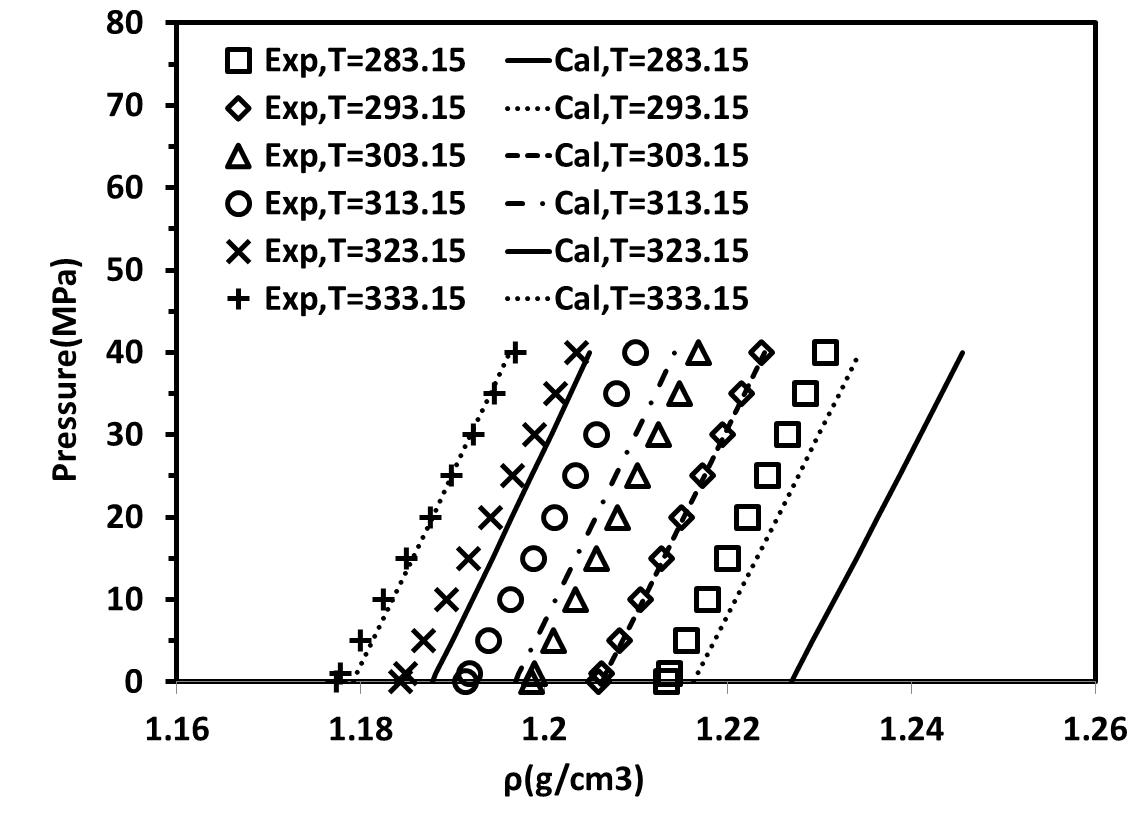 Finally, in order to realize the precision of our work compared to others, the results were compared to some models in the literature. Figure 7 shows the density- Pressure diagrams for [C4mim][BF4] considered as self-associating compounds with 10C association scheme at T=323.15 compared to Curras, et al [24]. Our result is more accurate than experimental data obtained in Curras et al. [24] Figure 8 shows CO2 solubility in [C4mim][BF4] compared to Ashrafmansouri and Raeissi [30] at T=333.15 . In this case, our result is close to experimental data and slightly better than Ashrafmansouri and Raeissi [30].