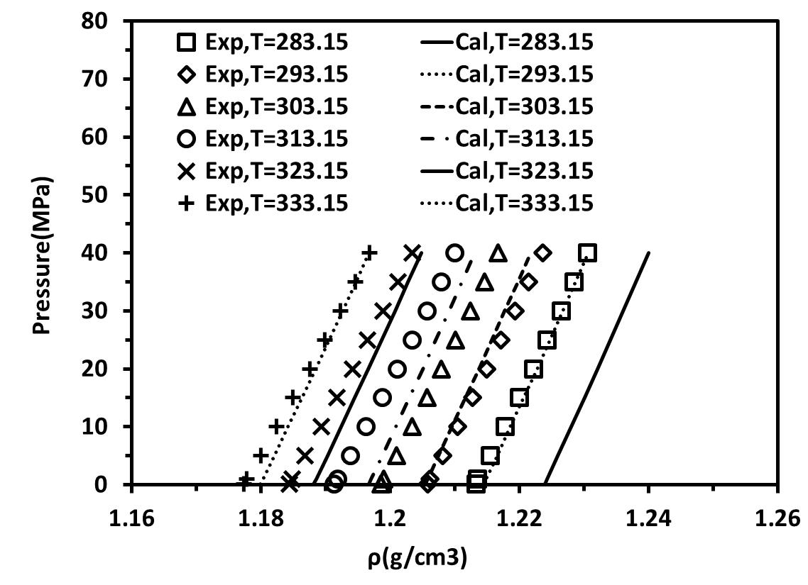 After obtaining parameters at atmospheric pressure these parameters were used to predict the density of these two ILs at high pressure. Tables 3 and 4 present the AARE % between experimental and calculated liquid densities of these two ILs at wide range of temperatures and high pressures up to 60 MPa for non-association and self-associating compound with 10C association scheme, respectively. Figures 3a and 3b show density- Pressure diagrams for self-associating and non-associating compounds at high pressure up to 60 MPa respectively. The results show t good agreement with the experimental data.