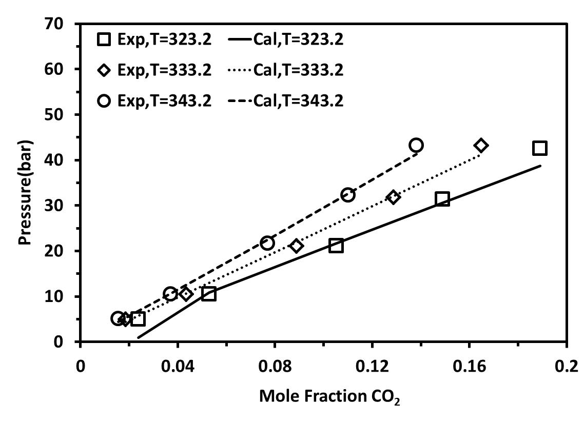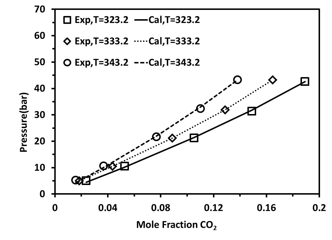 After tuning paratemrs of sPC-SAFT EOS for ILs, these parameters were tested against prediction/correlation of solubility of CO2 in these two ILs. CO2 was considered as a non-associating molecule. Parameters for CO2 were adapted from the literature [15]