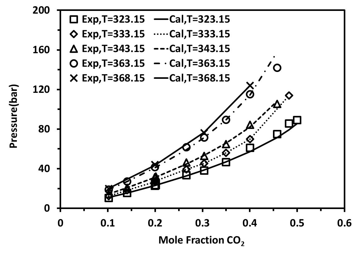 Figure 5. Solubility of CO2 in [C4-mim][BF4] as as self-associating compounds with 10C association scheme at different temperatures with a temperature-dependent kij parameter. |