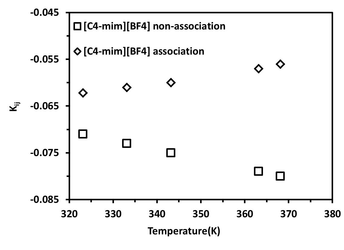 Figure 6. Dependence on temperature of the binary interaction parameter for different ILs mixed with CO2 .(a) [C2-mim][BF4] and (b) [C4-mim][BF4] |