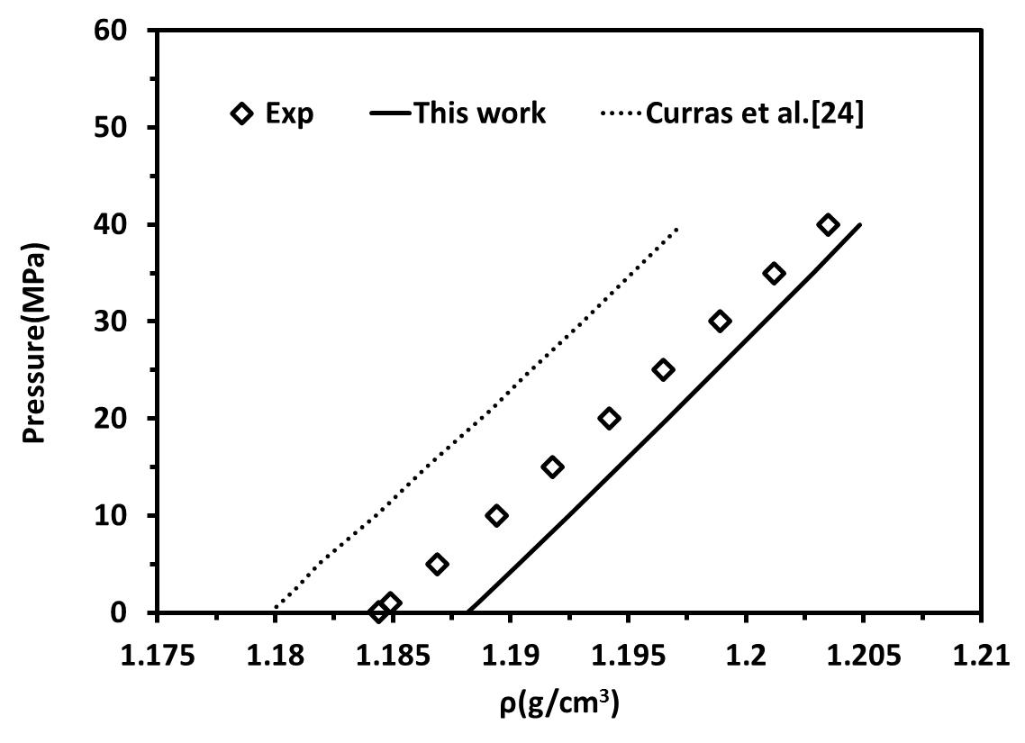 Figure 7. density- Pressure diagrams for [C4mim][BF4] considered as self-associating compounds with 10C association scheme at T=323.15 and high pressure compared to Curras, et al. |