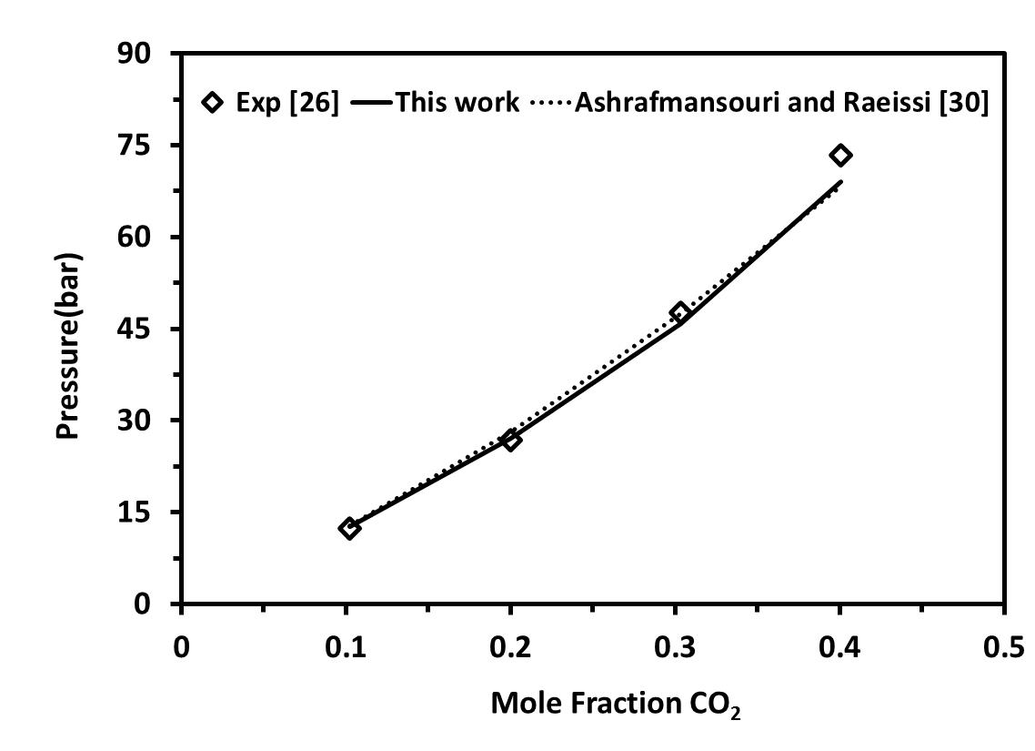 | Figure 8. CO2 solubility in [C4mim][BF4] as self-associating compounds with 10C association scheme compared to Ashrafmansouri and Raeissi at T=333.15 |