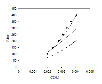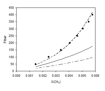 A strong mixing rule is the one that not only correlates well with experimental data of binary systems, but also predicts the phase behavior of multicomponent mixtures properly. Tables 7 and 8 show the deviation of the predicted results from the experimental data for the ternary systems of (methane + ethylene glycol + water) and (ethane + ethylene glycol + water), respectively. Using the LCEOS1 mixing rule, the results of prediction for both ternaries are much better than other mixing rules. Figures 5 and 6 show the prediction of methane and ethane solubility in 60% ethylene glycol in the aqueous phase on hydrocarbon free basis at 293.14K, respectively. The results of the LCEOS1 mixing rule were in excellent agreement with the experimental data.