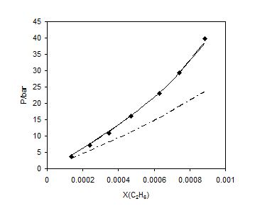 Figure 6. Comparison of different mixing rules for the prediction of ethane solubility in solution of 60% ethylene glycol in the aqueous phase on hydrocarbon free basis at 293.2 K; ■, experimental data [20]; – –, LCEOS1; —–, LCEOS2; – ۔ , VdW.