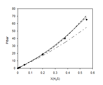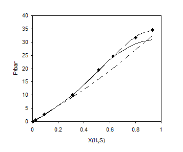 Table 6 shows the results of prediction for the three binary systems. So the results of LCEOS1 mixing rule present better accuracy for methane+TEG and H2S+TEG systems and WS-NRTL shows more accuracy for ethane+water system. Figure 4 shows the predicted results of H2S in TEG at 398.15 K.